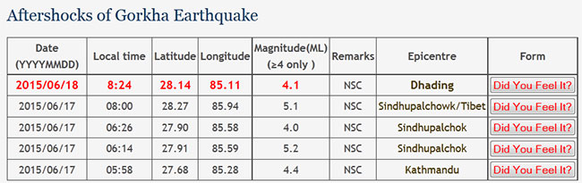 यसअघि मंगलबार राति नौ बजेर ५६ मीनेटमा दोलखालाई केन्द्र विन्दु बनाएर ४.१ म्याग्नेच्यूटको पराकम्पन गएको थियो ।